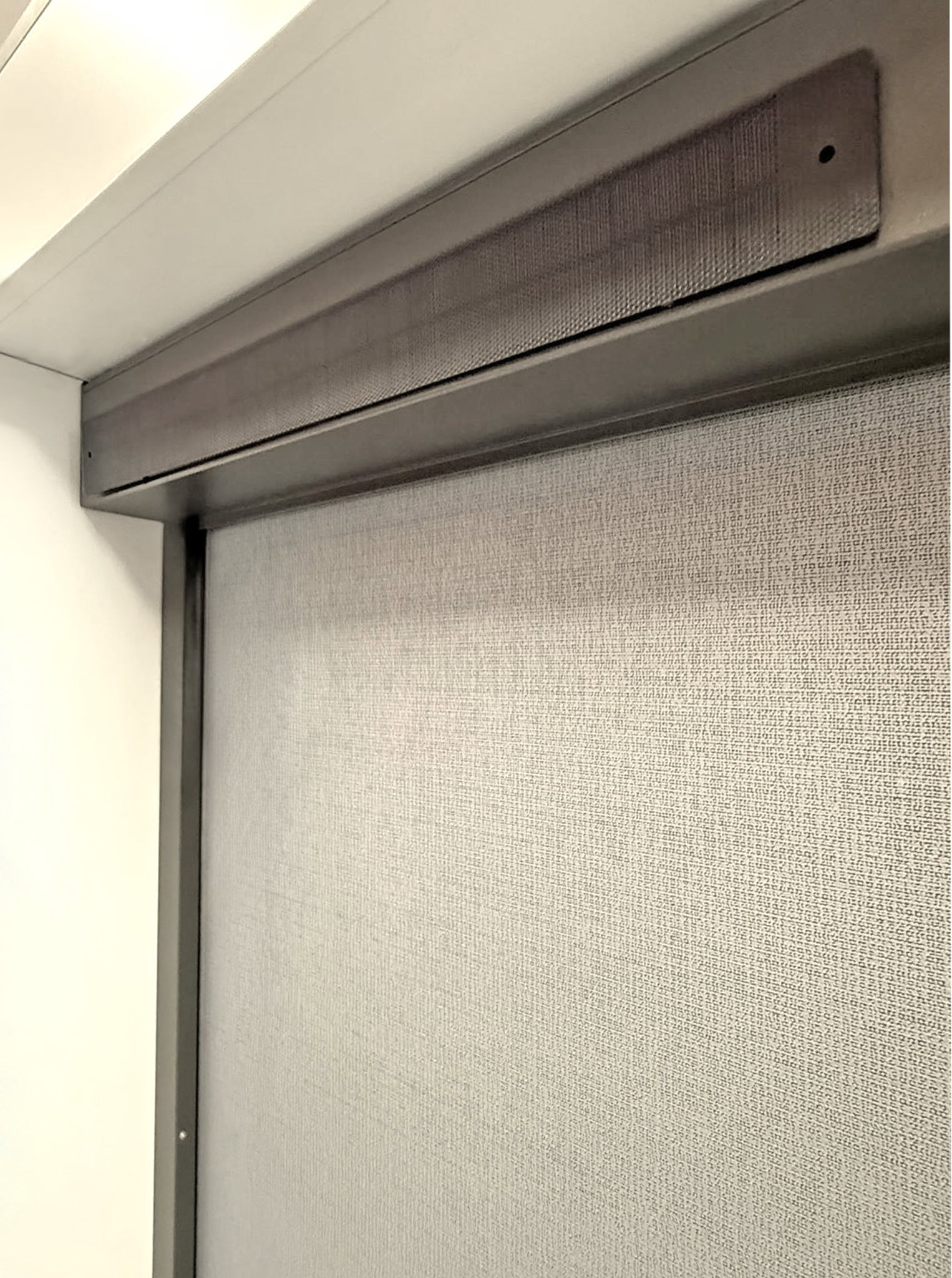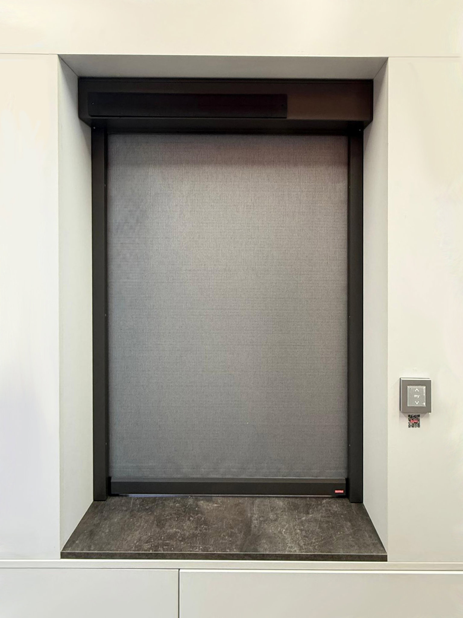 This roller shutter has a unique system of rails that ensures its high resistance to wind and keeps the fabric perfectly taut and in place in the guide rails. The box can be mounted in front of the window opening on the facade or in the window opening in the window reveal using mounting brackets that match the design of the box, while there is no gap between them and the box.
